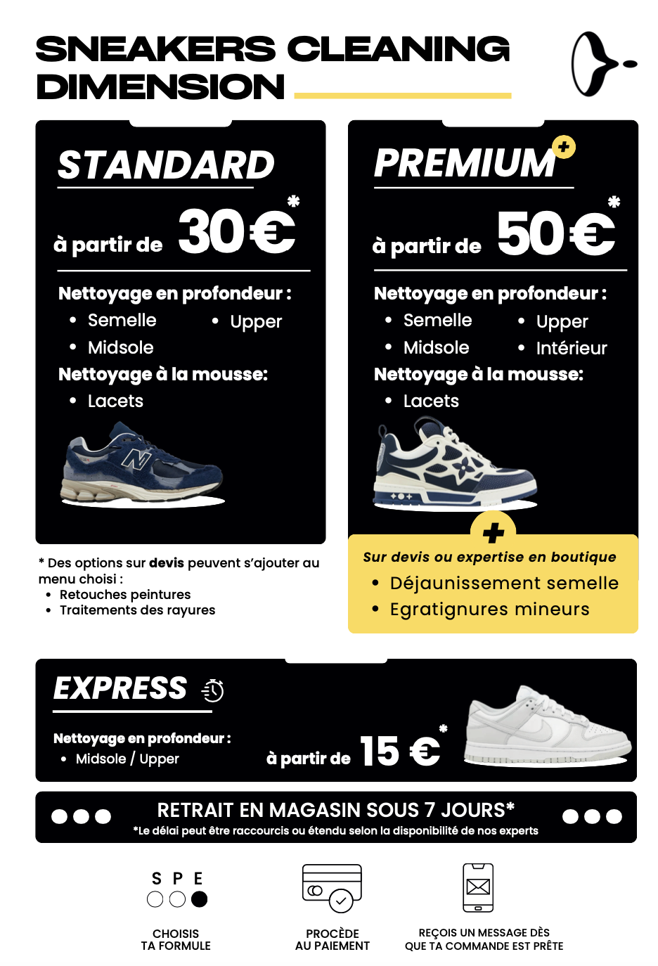 Donne une nouvelle vie à tes sneakers préférées ! Notre service de cleaning professionnel nettoie en profondeur tes paires (extérieur, semelles, lacets…) pour un look quasi neuf